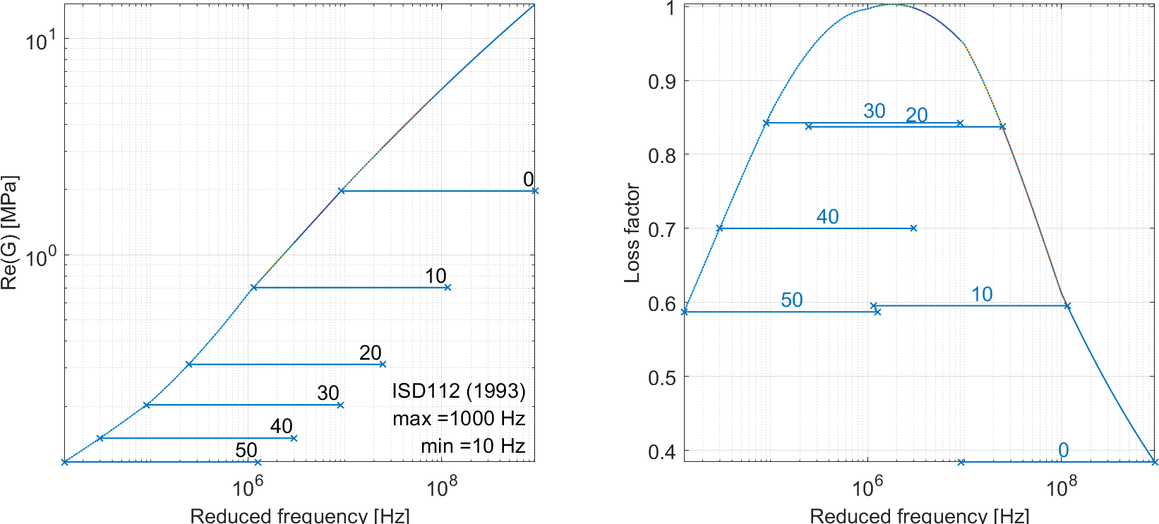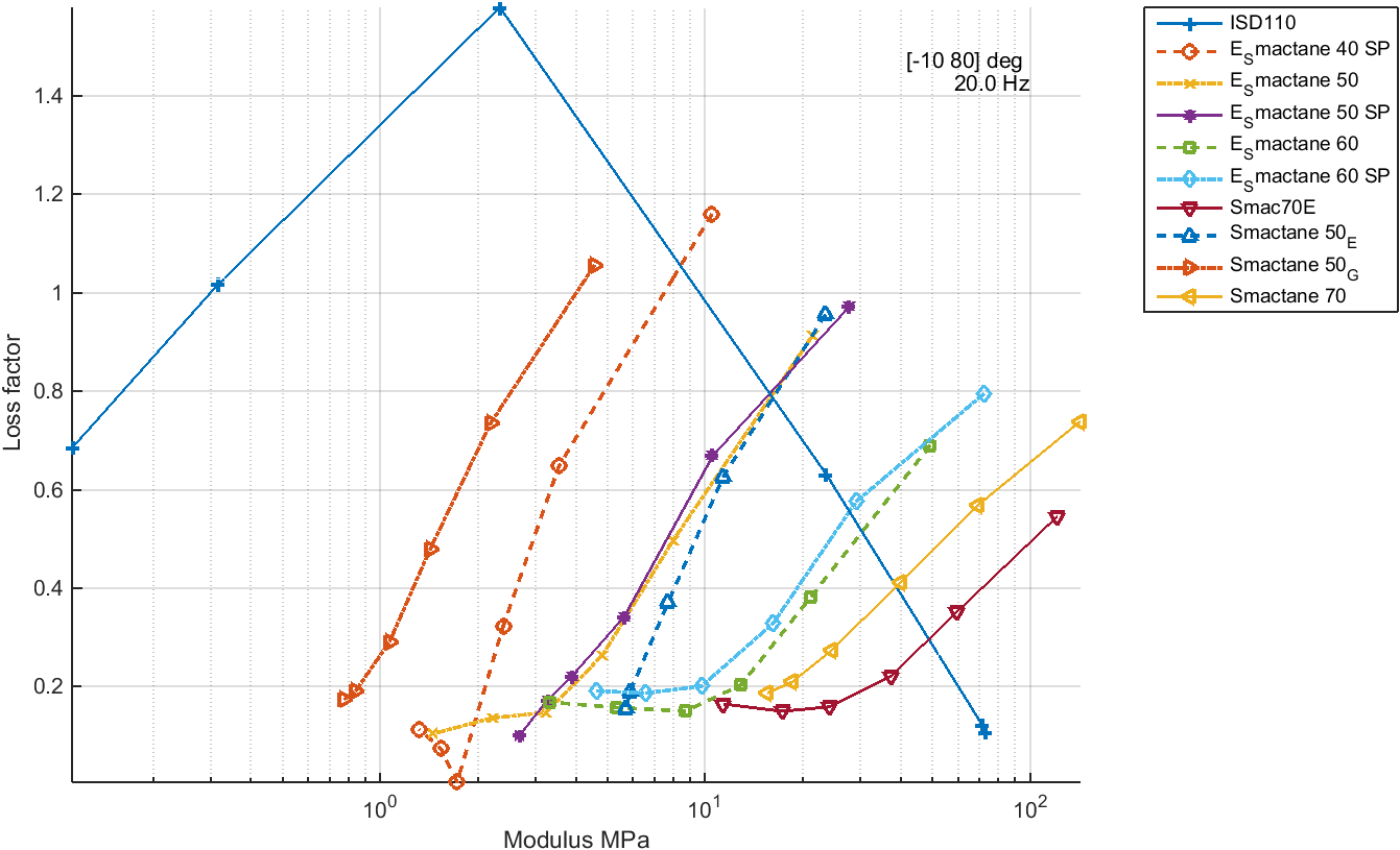 cf=feplot;cf.mdl='reset'; m_visco('database',cf);% open FEPLOT figure with database RO=struct('wtarg',20,'ttarg',[-10 5 20 40 60 80]'); mat=[stack_get(cf.mdl,'mat','#ISD'); % Get selected materials stack_get(cf.mdl,'mat','#Smac')]; cf.mdl.Stack=mat; % Once you have all desired entries, redraw m_visco('info -modmin 1e6 -etamin .2 -cf1',cf,RO);