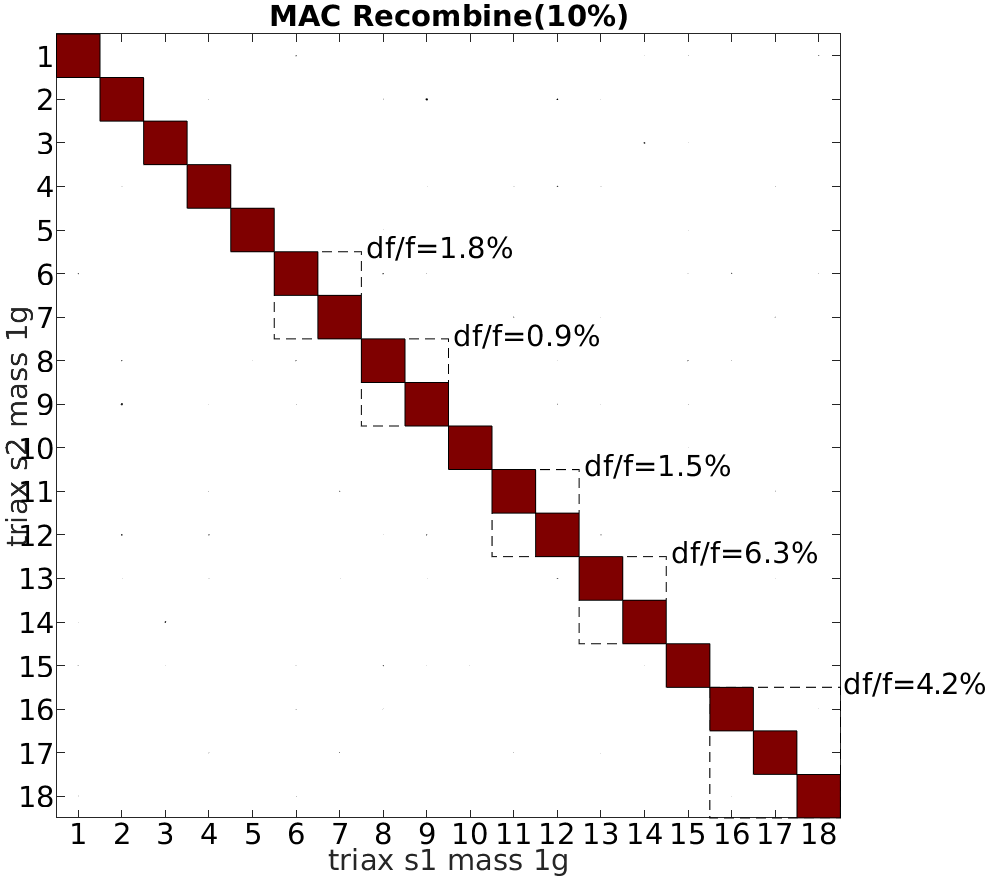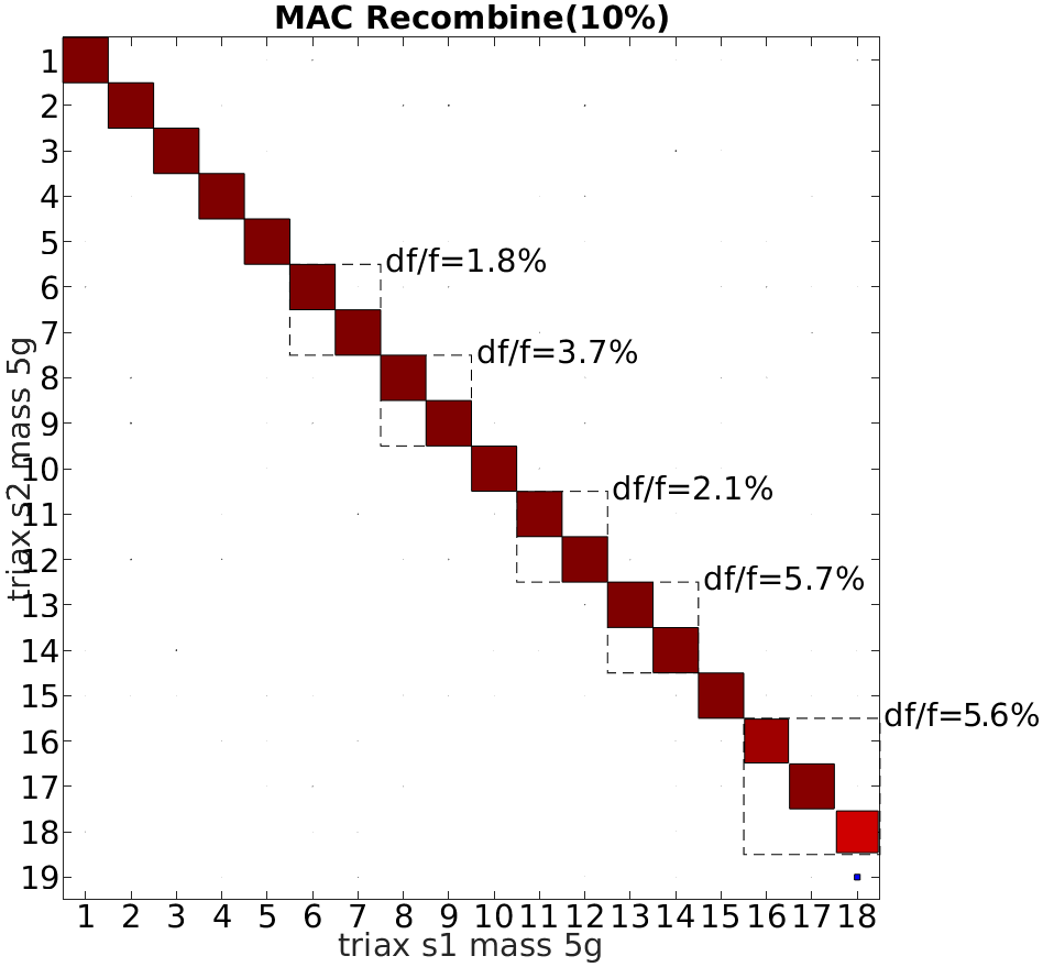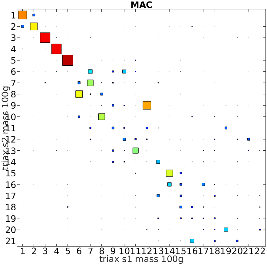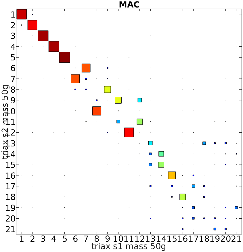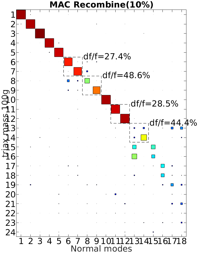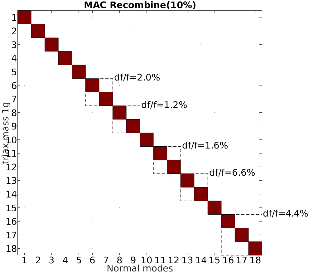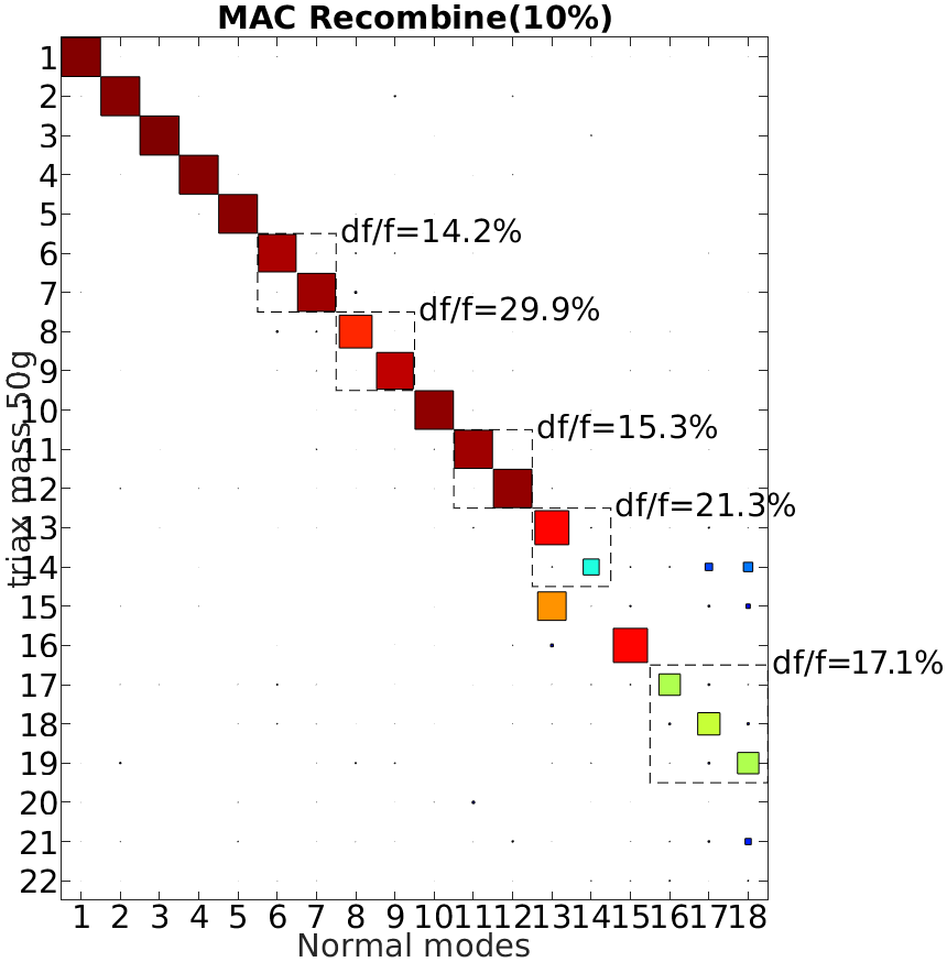 Comparing the modeshapes with the MAC directly shows the challenge ahead if no dead mass is added at non measured positions. From the 5 grams sensor a new mode appears on only one set. For higher mass configurations, passed the first few modes, the modeshapes become clearly different so that both batches cannot be considered as measuring the same structure.