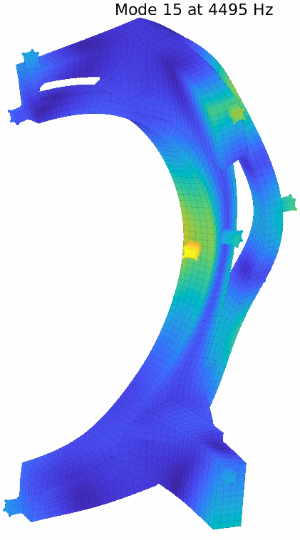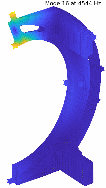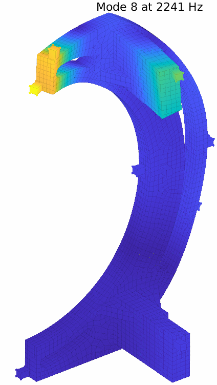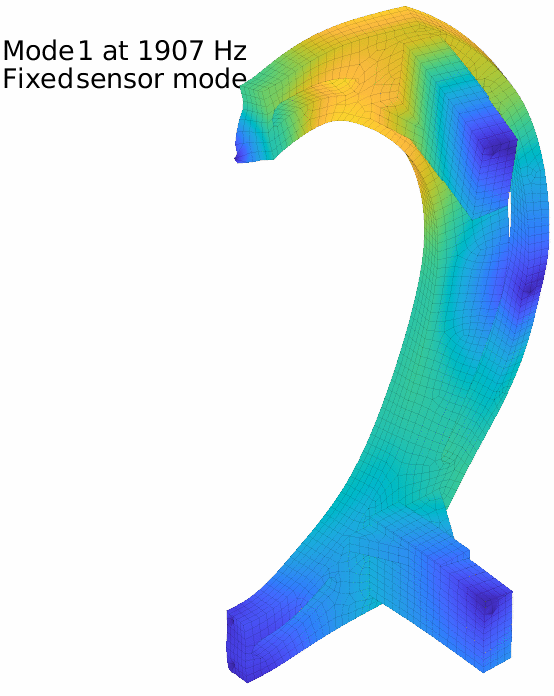 The observation of the added mass configuration modeshapes illustrate the phenomenon. For the lower modes, the global shape does not change, but getting to modes where the displacement can become more localized the sensors position can alter the displacement field or even generate new modes in the frequency bandwidth as mode 16 with the local banana foot torsion.