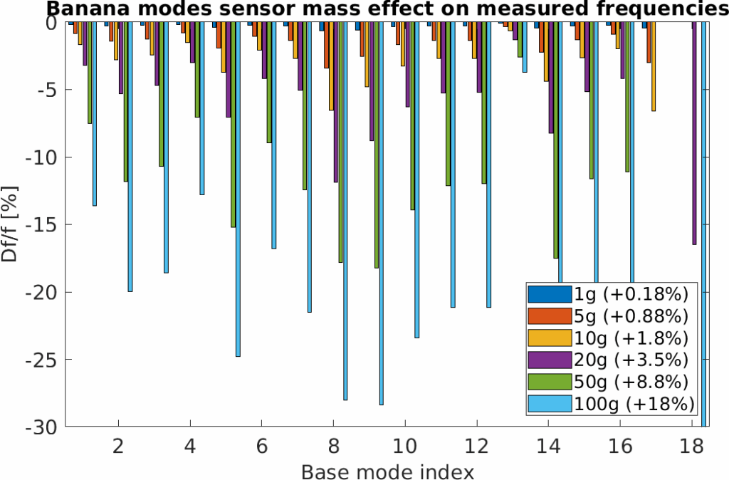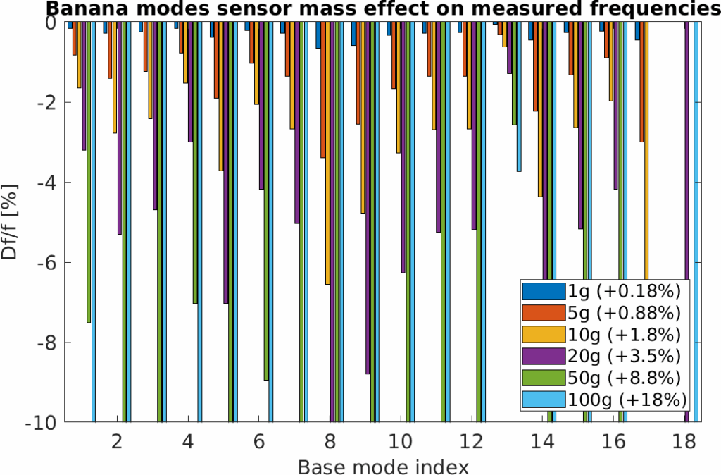 The effect on frequencies is not negligible. For the light 1 gram sensors, a maximum of 1% in frequency deviation is observed, already attaining more than 3% with the 5 grams configuration. Getting to the ‘heavier’ options, deviations of 15% or more are expected.