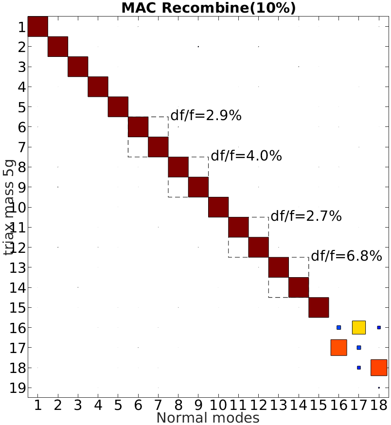 Besides frequency the shapes can also be altered, the MAC between the base modes and the added sensors configurations are presented below. Our MAC recombination feature is enabled to ensure robustness to mode crossing related to the quasi-double modes associated with the banana columns bending. The higher frequency modes around 5kHz are impacted even with 5 grams sensors. Getting to 50 grams and more, the higher frequency content becomes very different.