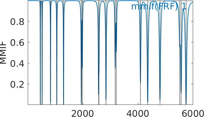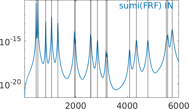 Using the normal modes for the transfer with a uniform modal damping of 0.5%, the transfers can be quickly synthesized using function nor2xf https://www.sdtools.com/help/base/nor2res.html. A post-treatment to display the sum of all imaginary parts (SUMI) or the MMIF indicator associated with pole markers allows ensuring that every mode is theoretically excited and visible.