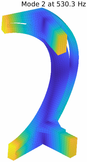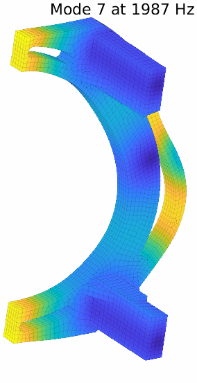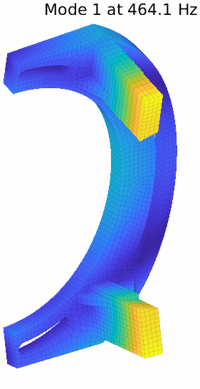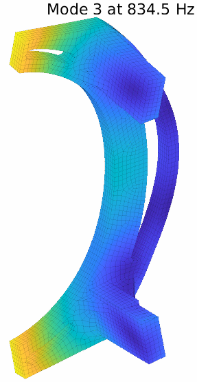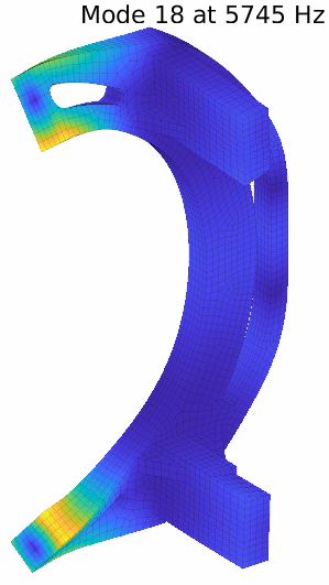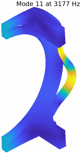 To illustrate how to optimize a test campaign regarding sensor and excitation positioning a sample bracket component that we studied in the past will be used, we call it the banana. This bracket has some very interesting features as its dimensions and voids generate many modes at frequencies close to automotive axle components. Besides it is almost symmetrical and can be used to demonstrate other correlation peculiarities. A few of the banana modes are illustrated below: