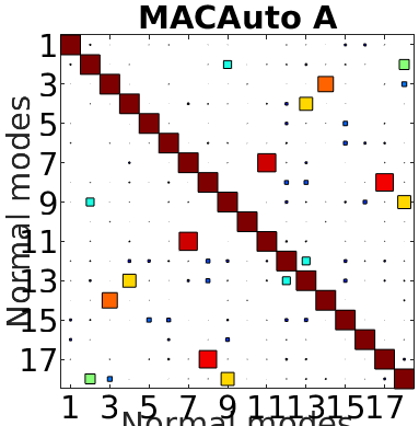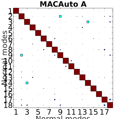 The MSeq algorithm can then be used to add sensors to the pre-existing list until we get a better result. For 18 modes an almost perfect diagonal auto-MAC is obtained with 17 sensors, displayed in the figure below. Due to the banana symmetry and high handle flexibility almost a sensor per mode is required!