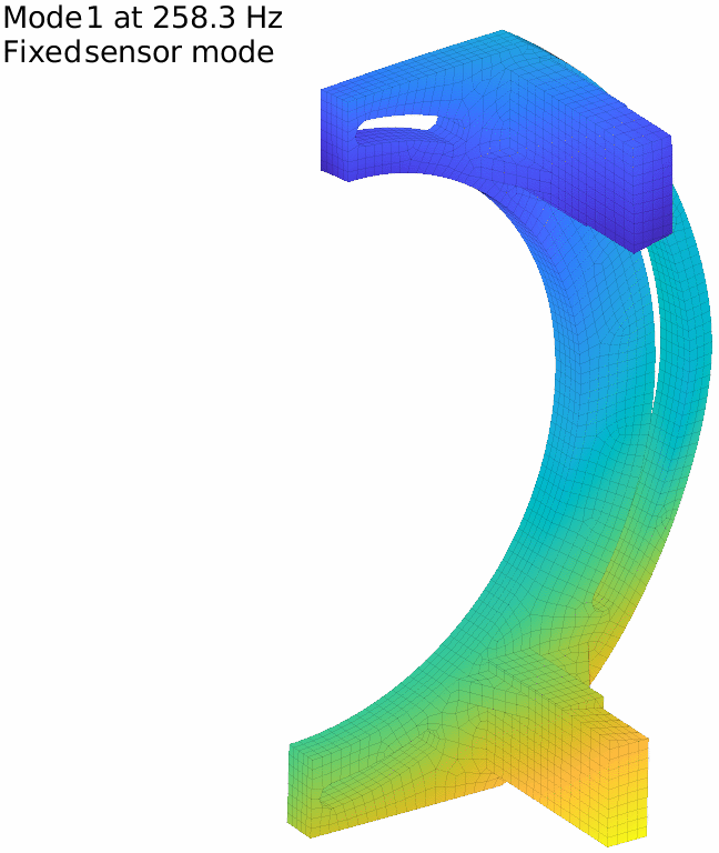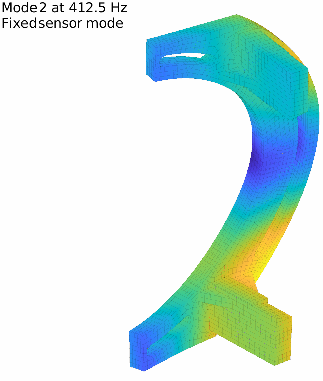 The first fixed sensor mode show an horizontal translation of the lower column, coherent with the fact that no horizontal translation is measured on the lower side. Adding a sensor there improves the behavior, and one can iterate this way until getting to a high enough minimal frequency